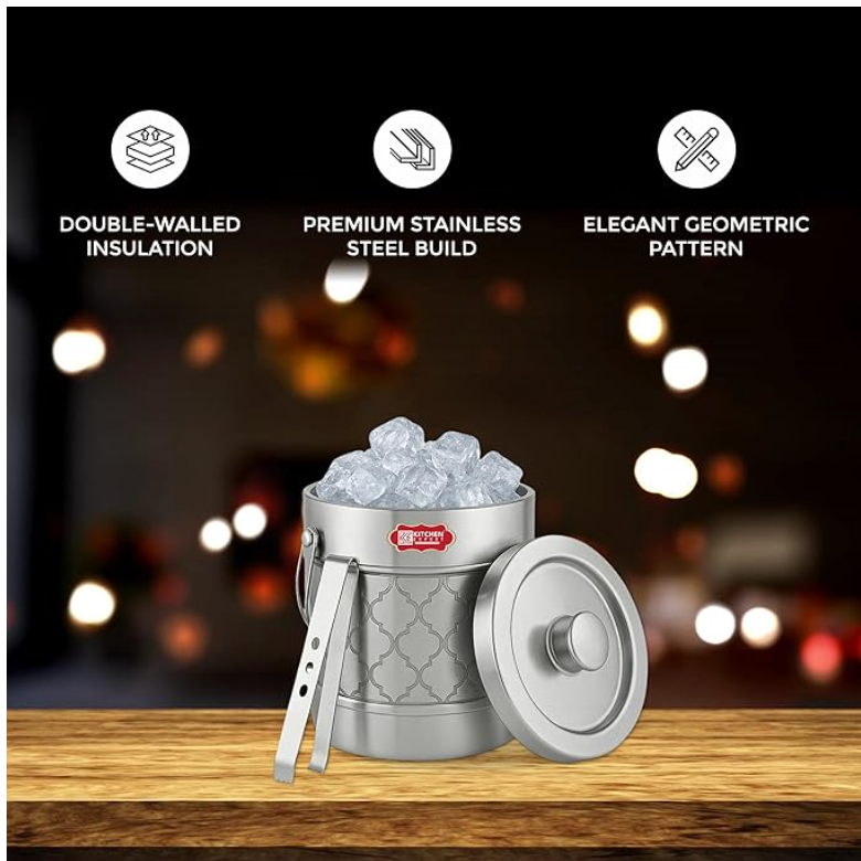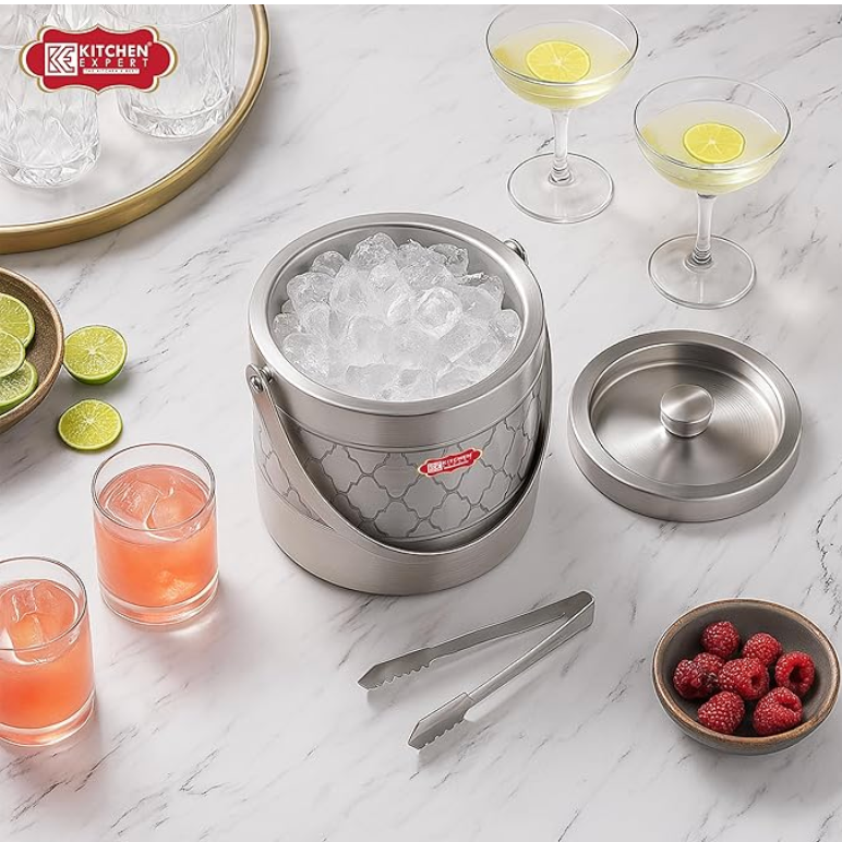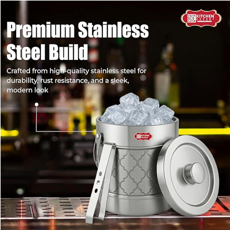 Kitchen Expert Stainless Steel Insulated Ice Bucket with Lid | 1.5 LTR | Steel Bucket with Tong | Insulated Bar Box | Ice Cube Holder | Bar Accessories | for Bar & Home