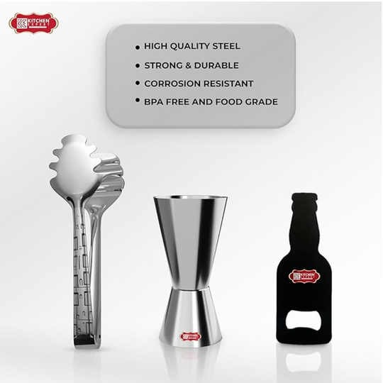 Kitchen Expert Stainless Steel Barware Accessories | Set of 3 | Ice Tong/Double Sided Peg Measure/Black Matte Bottle Opener | Essentials for Cocktail | Bar Tool Set | Perfect Combo