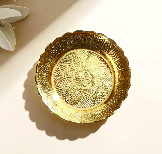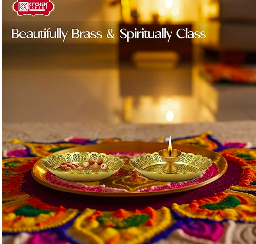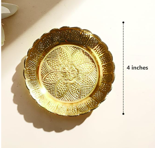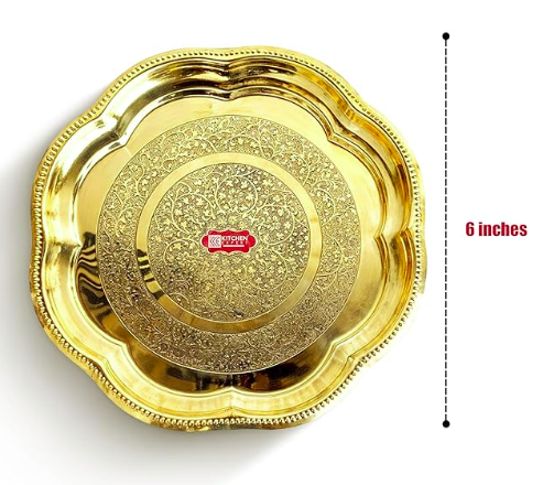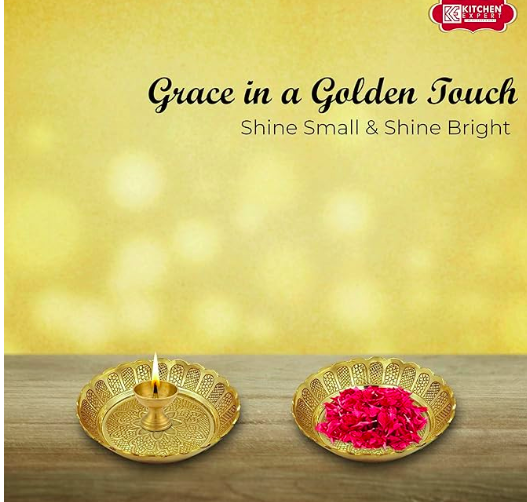 Kitchen Expert Small Brass Plate | 12cm | Pooja Thali | Engraved Flower Design | Ideal for Puja/Prasad/Dia | Mandir Plate | Handcrafted Dia Plates
