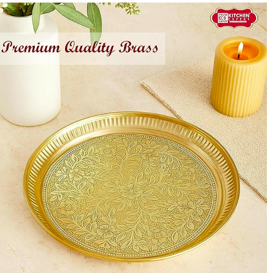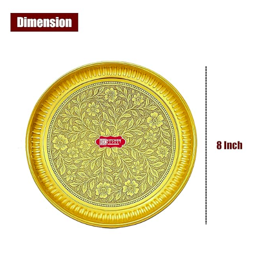 Kitchen Expert Small Brass Plate | 20cm | Aarti/Pooja Thali | Engraved Flower Design | Brass Plate | Ideal for Puja/Prasad/Dia | Mandir Plate | Handcrafted Dia Plate | for Puja Ceremony | Gold (Round)