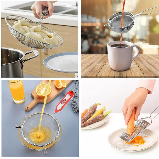 Stainless Steel Combo of Soup Strainer, Puri Jhara, Tea Strainer & Ginger Grator | Strainers for Kitchen | Channi Set for Kitchen