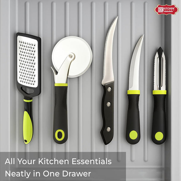 Kitchen Expert Stainless Steel Utility Combo | Set of 5 | Cheese Grater, Pizza Cutter, Vegetable Knife, Potato Peeler | Ideal for Grating Cheese, Ginger, Vegetables, Fruits | Kitchen Knife Set