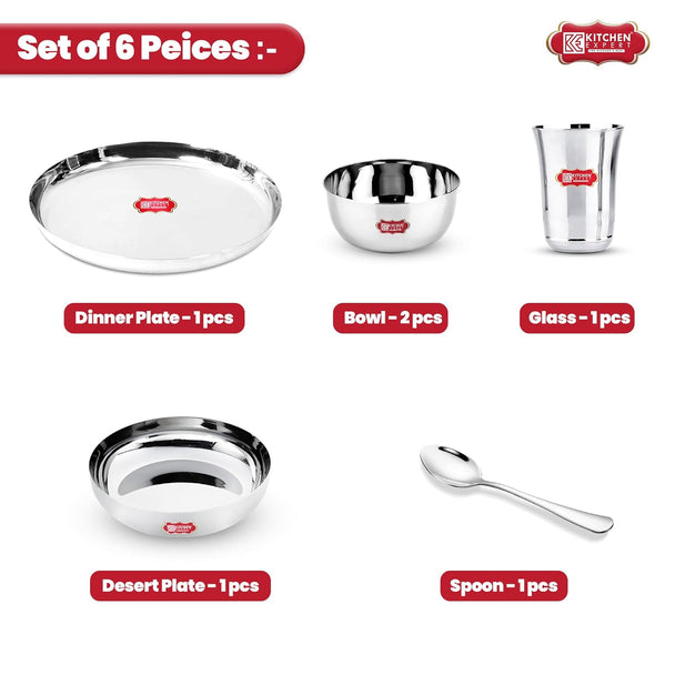 Kitchen Expert - Stainless Steel Premium Dinner Set | Heavy Steel Plate | Dinner Set Combo | Round Thali | Mirror Polish | Set of 6 PC (1 Thali, 2 Bowls, 1 Mini Sweet Dish Plate, 1 Glass and 1 Spoon)