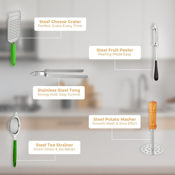 Kitchen Expert Stainless Steel Kitchen Tools Combo | Set of 5 | Tea Strainer, Cheese Grater, Steel Tong, Wooden Masher, 3 in 1 Peeler | Ideal for Grating, Straining, Peeling | Sharp Blades