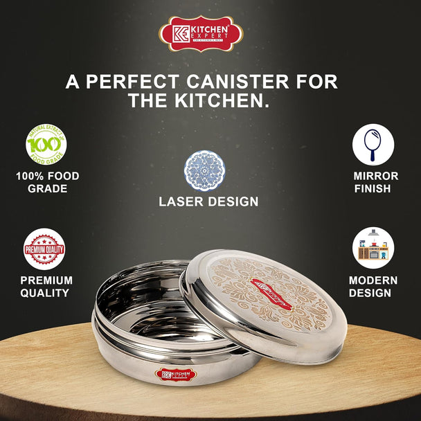 KITCHEN EXPERT Stainless Steel Flat Canister/Puri Dabba/Storage Container (Set Of 3, 300 ML, 500 ML, 1100 ML)