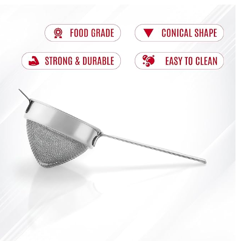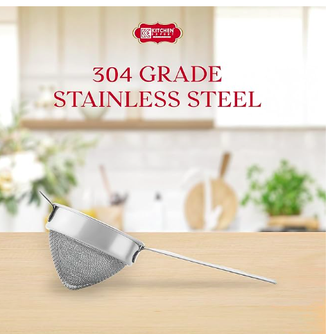 Kitchen Expert Stainless Steel Tea Strainer | 304 Grade | Conical Shape with Double net | Steel Tea Strainer | Chai Chalni | Oil Filter with Wire Handle | Tea/Coffee/Channi | 1pc