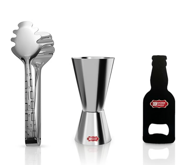 Kitchen Expert Stainless Steel Barware Accessories | Set of 3 | Ice Tong/Double Sided Peg Measure/Black Matte Bottle Opener | Essentials for Cocktail | Bar Tool Set | Perfect Combo